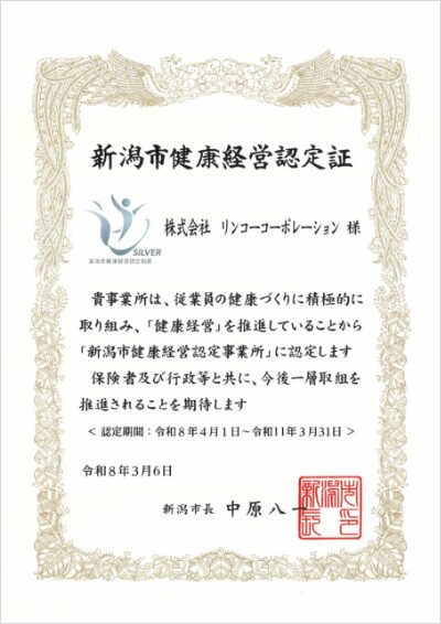 この度、弊社は「新潟市健康経営認定制度」において【シルバークラス】に認定されました。