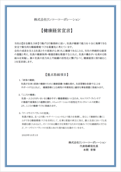 健康への取り組みについては(株)リンコーコーポレーション安全衛生方針もご参照ください。