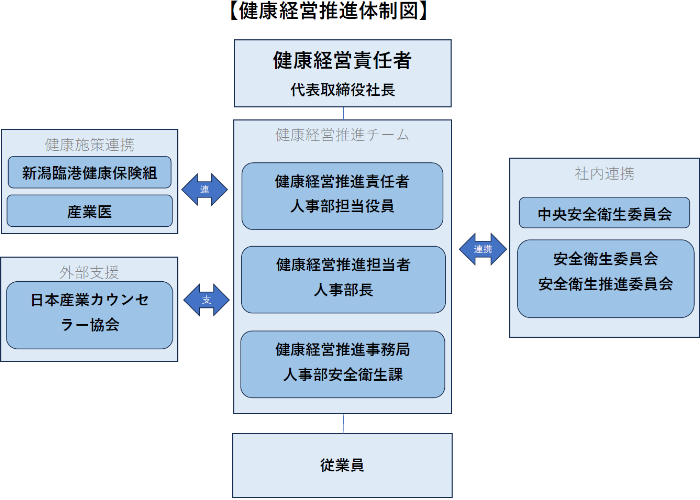 - 新潟臨港健康保険組合、労働組合、産業医、人事部、各事業所、各グループ会社が連携し健康課題に取り組みます。